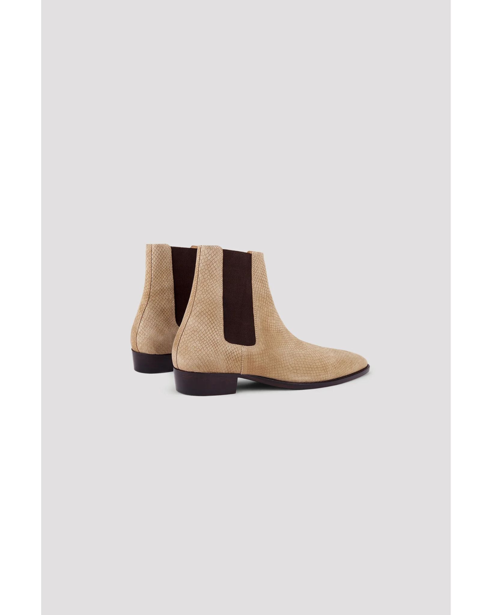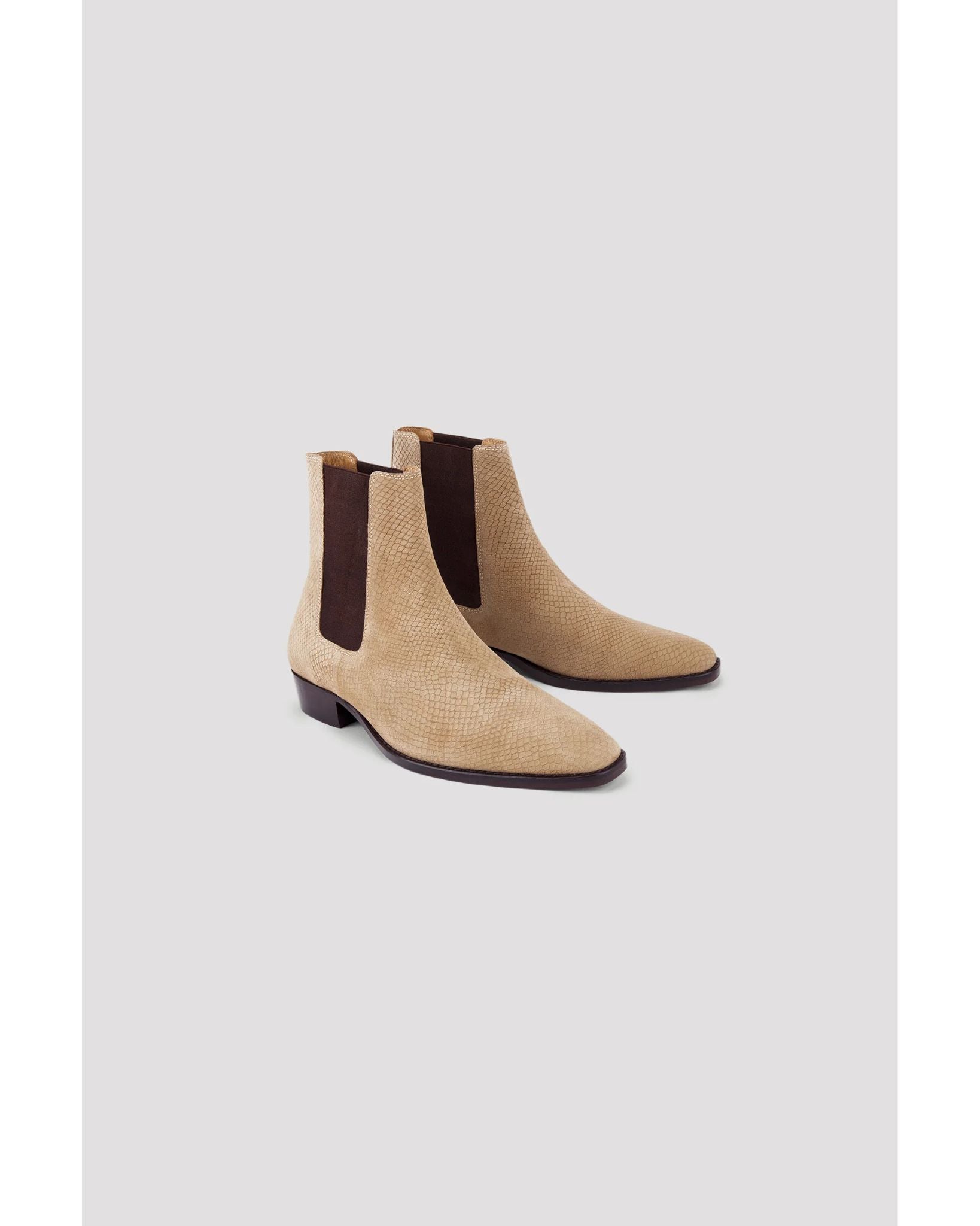 チェルシー発祥のブランド、Frayは、ミニマルなデザインとモダンなプロポーションで、アイコンシューズを現代風にアレンジ。FRAYのシグネチャーであるこのシューズは、エンボス加工を施したスネークスキンをイタリアで丁寧にハンドメイドで仕上げ、伸縮性のあるサイドやスタックキューバンヒールといった伝統的なデザインディテールが特徴です。