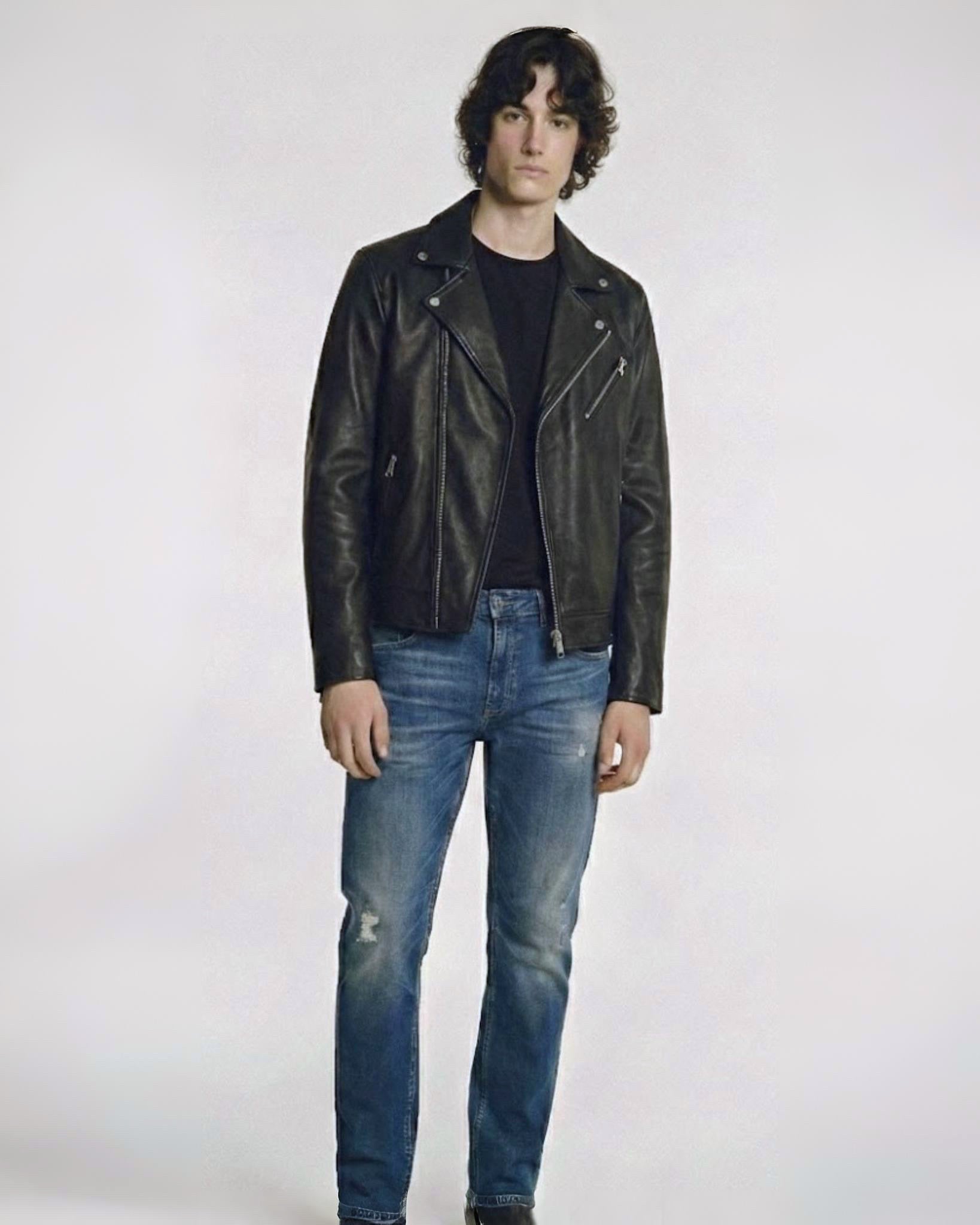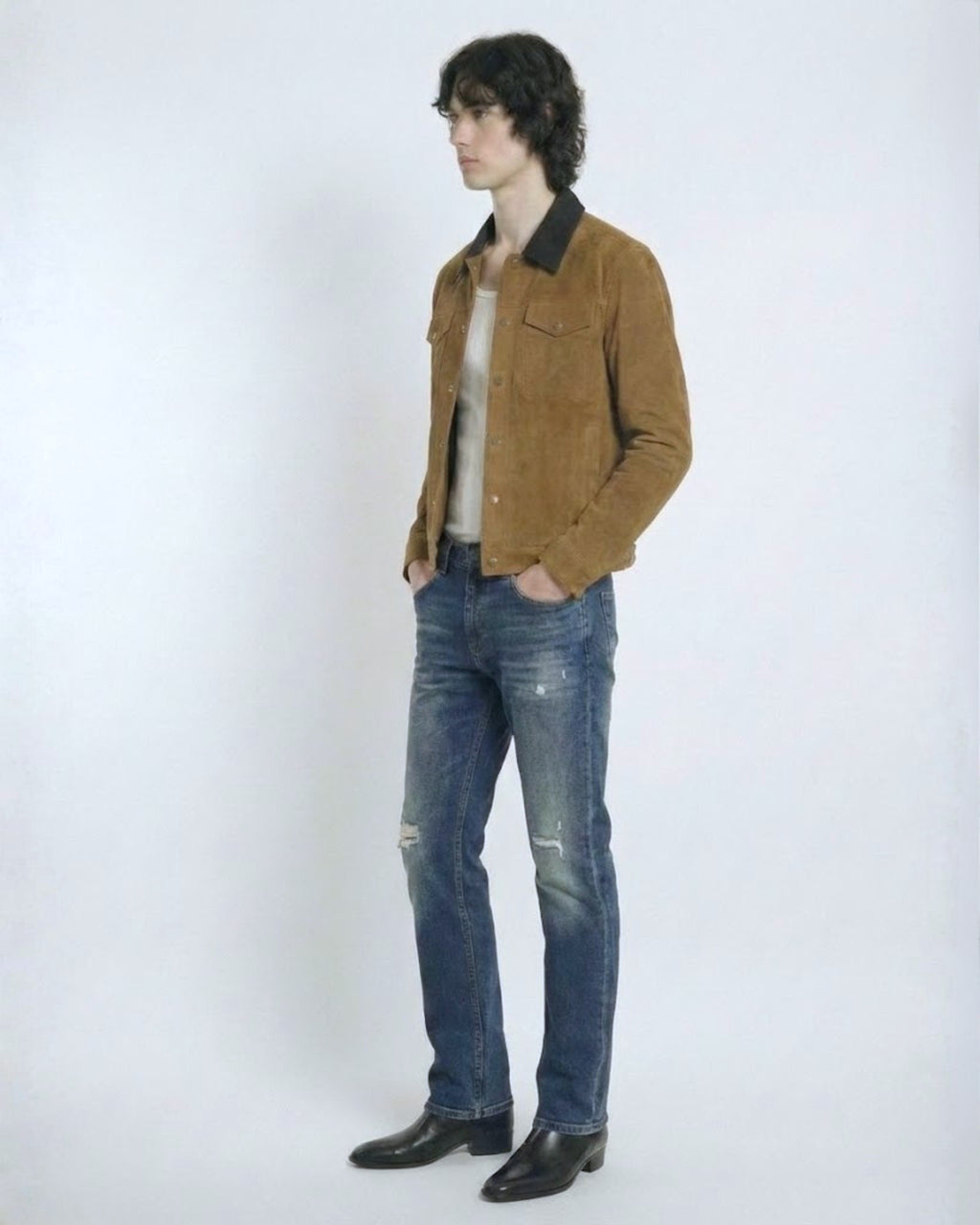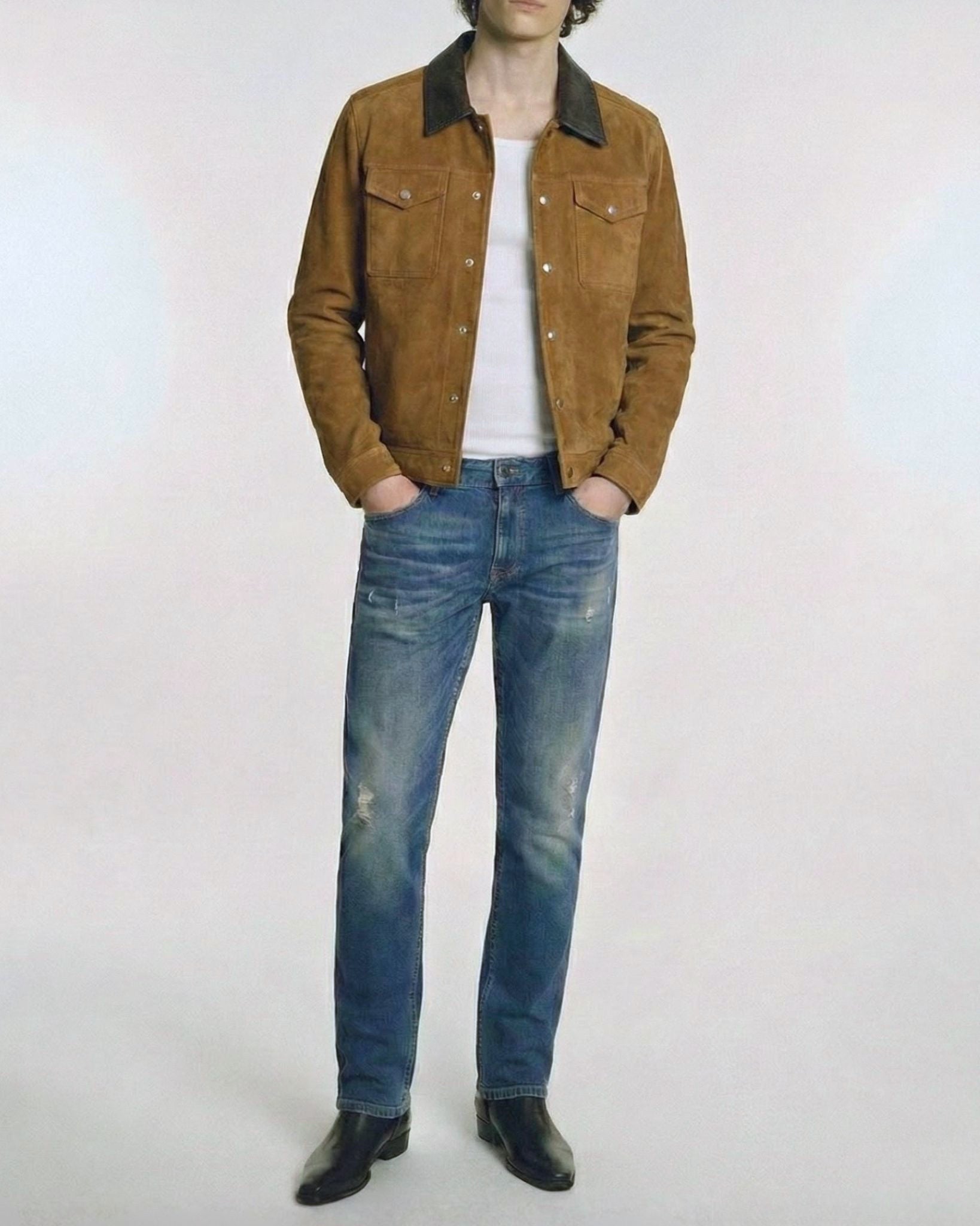 フレイデニムは、丁寧にエイジング加工を施し、手作業で仕上げることで、愛着のある風合いに仕上がっています。タバコ色のスエードパッチが洗練された雰囲気を添えています。ヴィンテージ風のウォッシュ加工とスタイリングが、時代を超えた魅力を瞬時に演出します。シグネチャーのスリムフィットは、膝から裾にかけてテーパードし、美しいシルエットを演出します。
